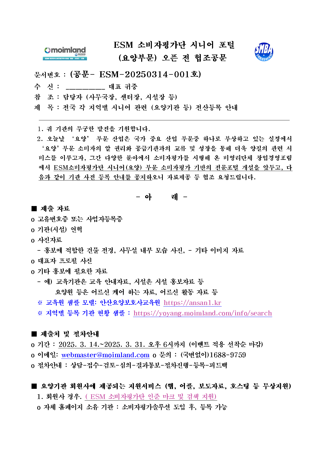 (공문- ESM-20250314-001호) ESM 소비자평가단 시니어 포털 (요양부문) 오픈 전 협조공문