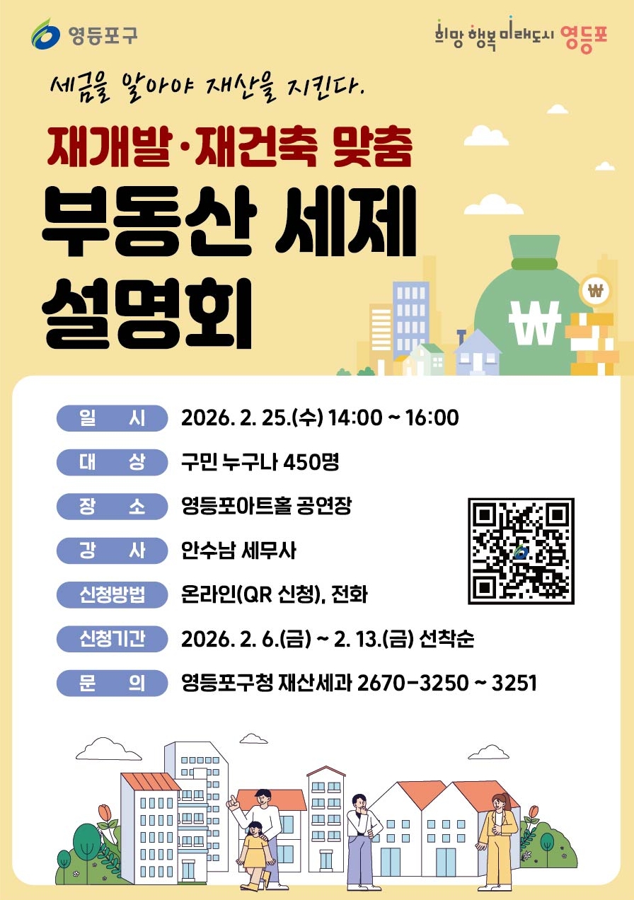 영등포구(구청장 최호권)가 영등포 전역에서 87개 재개발 재건축 등 정비사업이 추진되면서 높아진 부동산 세제에 대한 관심에 부응하고자, 오는 25일 영등포 아트홀에서 ‘재개발 재건축 맞춤 부동산 세제 설명회’를 개최한다고 밝혔다.