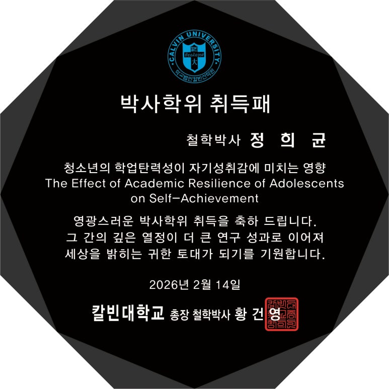 더엠지씨(THE MGC) 정희균 대표가 칼빈대학교 대학원에서 사회복지학 박사학위 인준을 통과했다. 정 대표는 청소년의 학업탄력성이 자기성취감에 미치는 영향을 연구했다. 졸업식은 오는 2월 14일 열릴 예정이다.