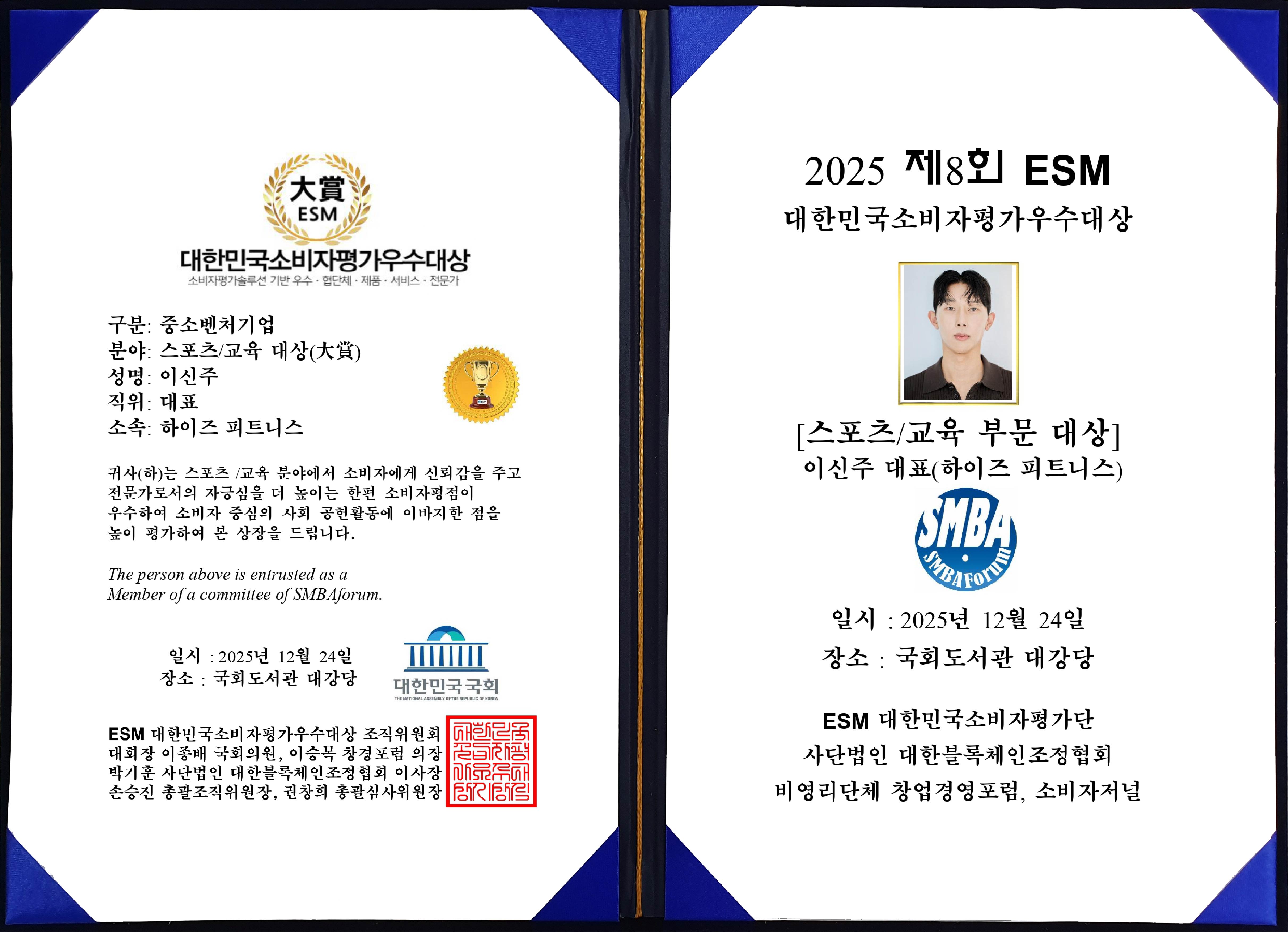 하이즈 피트니스 이신주 대표가 지난 12월 24일 국회도서관 대강당에서 열린 ‘2025 제8회 ESM 대한민국소비자평가우수대상’ 시상식에서 스포츠·교육 부문 대상을 수상했다.