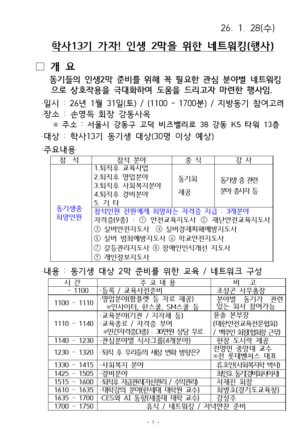학사장교 13기 총동기회는 1월 31일(토) 오전 11시부터 오후 5시 30분까지, 서울 강동구 고덕 KS타워에 위치한 KS한국고용정보 대회의실에서 ‘학사13기 함께 가자! 인생 2막을 위한 네트워킹 행사’를 성공적으로 개최했다.